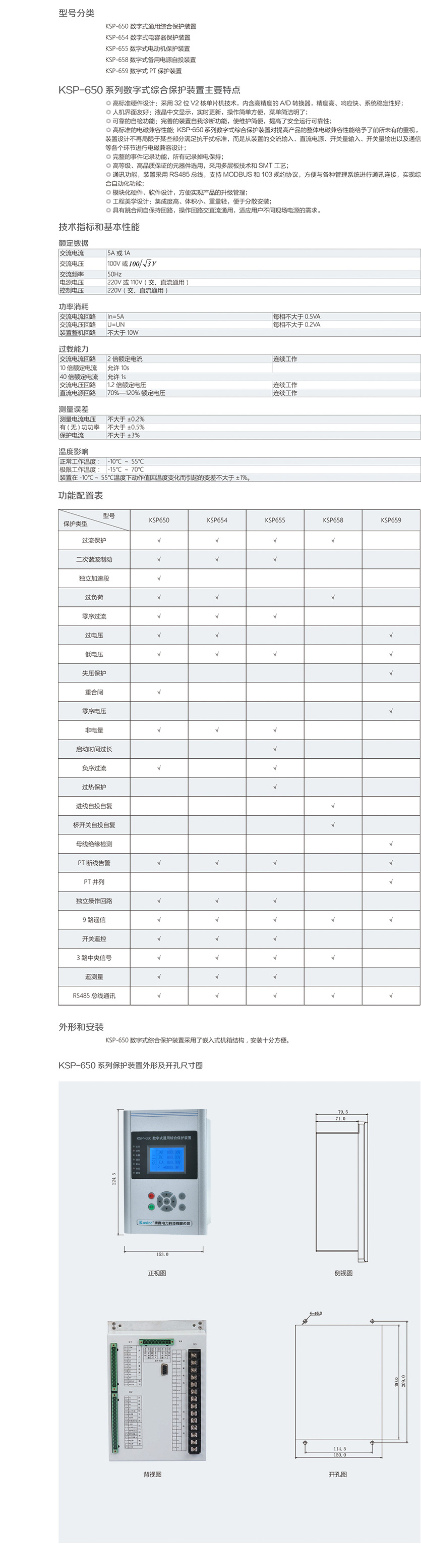 KSP-650 系列數(shù)字式保護(hù)裝置,是我公司最新推出的一款實(shí)用型綜 合保護(hù)裝置。裝置功能齊全,運(yùn)行穩(wěn)定,采用通用型一體化設(shè)計(jì)理 念,具備保護(hù)、測(cè)量、控制、通訊完備的功能,廣泛適用于 35kV 及 以下電壓等級(jí)變配電站、開(kāi)閉所等場(chǎng)合。新穎的結(jié)構(gòu)設(shè)計(jì),外觀時(shí)尚, 結(jié)構(gòu)精巧,既適用于安裝在中置柜內(nèi),也可方便安裝于柜體體積狹 小的環(huán)網(wǎng)柜等各種柜體。